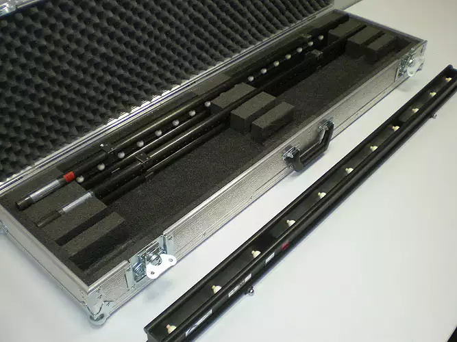 Fabricados en estructura de cerámica (Zerodour, Robax) o carbono con coeficiente de dilatación despreciable y bolas de cerámica como elementos de referencia. Se aplican en la calibración de máquinas de coordenadas de alta precisión y se fabrican en longitudes entre 100 mm y 2.000 mm. Se suministra con accesorios de montaje y caja metálica de transporte y protección.