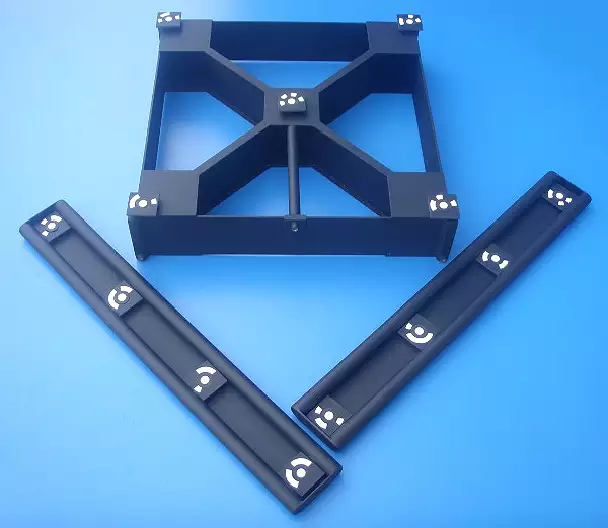 Fabricados en estructura de fibra de carbono y como elementos de referencia dianas en blanco sobre fondo negro. Debido a su diseño la calibración se realiza en nuestro laboratorio mediante máquina de medición de alta precisión (palpado táctil u óptico). Se suministra con accesorios de montaje y caja metálica de transporte y protección.